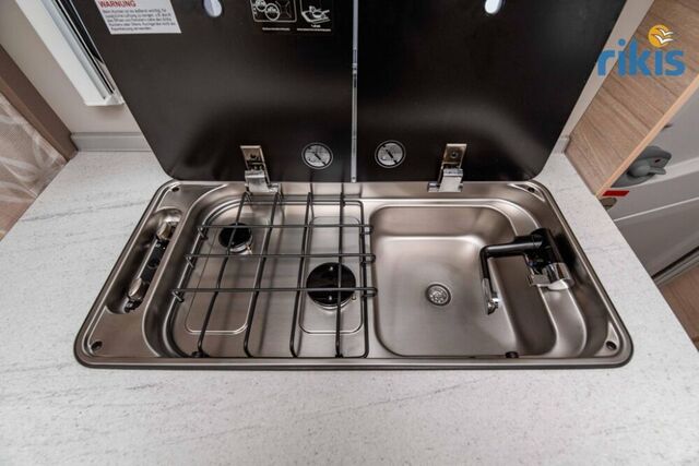 - Gas-Paket (Gasanlage) (Gaskasten mit großer Außenklappe, Kühlschrank 133 Liter (Gas / 12 V / 230 V), Gasheizung TRUMA S inkl. Umluftanlage, 2-Flammen-Kocher im Gasbetrieb)